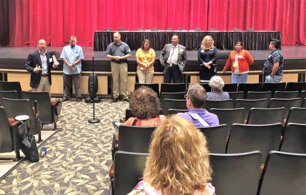 The following community leaders then served on a panel about educational attainment, from left to right, with Stallings moderating: Dan Martin, program officer, Cherokee Preservation Foundation; Joel Creasman, principal, Cherokee Central Middle School; Dr. Deb Foerst, principal, Cherokee Central High School; Dr. Mike Murray, superintendent, Cherokee Central School; Dr. Beverly Payne, assistant superintendent, Cherokee Central School; Jennifer Martens, instructional coach, Cherokee Central Elementary School; and Yona Wade, director of community affairs, Cherokee Central School. Juanita Wilson, director of talent development of the Eastern Band of Cherokee Indians, is not pictured.