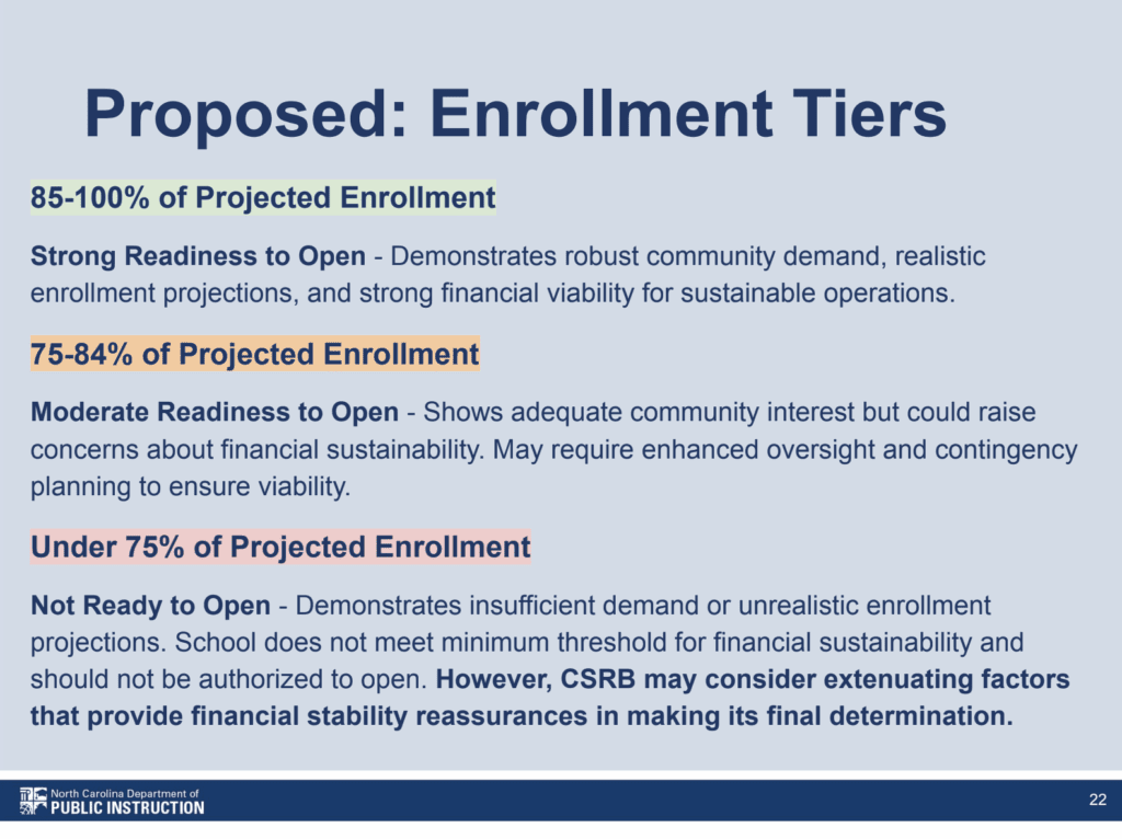 Schools below 75% of their projected enrollment will be deemed “not ready to open,” although the CSRB may evaluate “extenuating factors.”