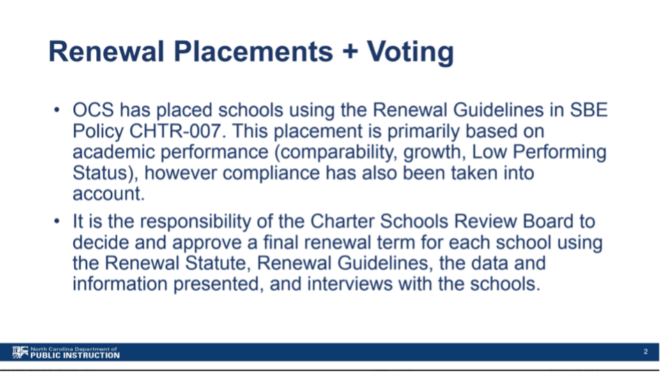 Renewal terms for each of these schools aligned with OCS recommendations. With the exception of Asheville PEAK, all of the schools are continually low-performing.