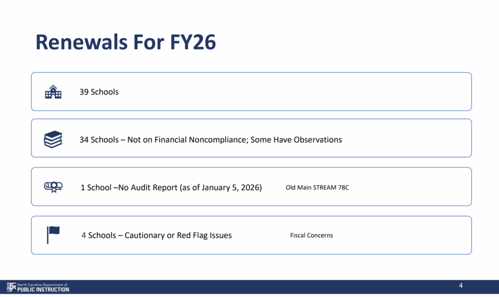 In addition to the 10-year renewals, three schools secured seven-year renewals, while nine earned five-year renewals. North Carolina’s two virtual charters, which together serve over 6,300 students, were among the five-year renewals.
