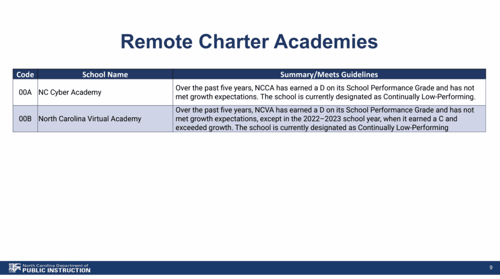 North Carolina’s two virtual charters, NC Cyber Academy and NC Virtual Academy, also earned five-year renewals. Both have operated under the state’s virtual charter school pilot since 2015, but that is slated to end this year.