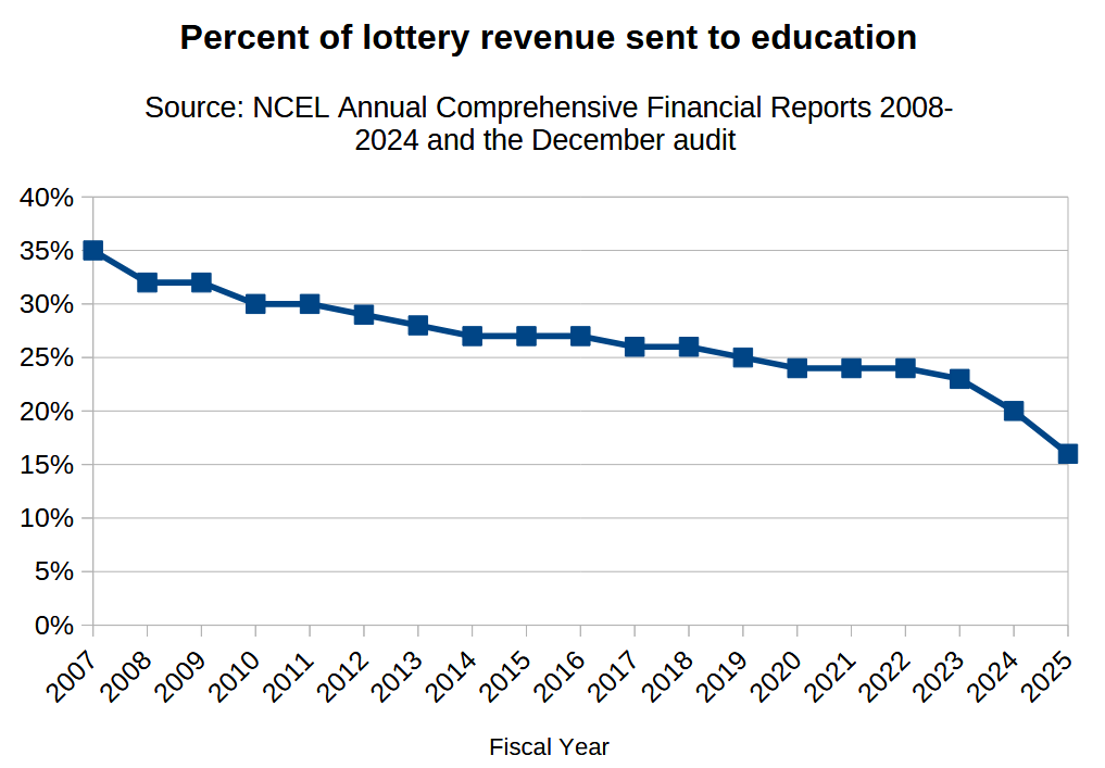 According to a press release, the overall percentage of revenue contributed by the NCEL to public schools has decreased from 23% in FY 2023, to 20% FY 2024, to 16% in FY 2025.