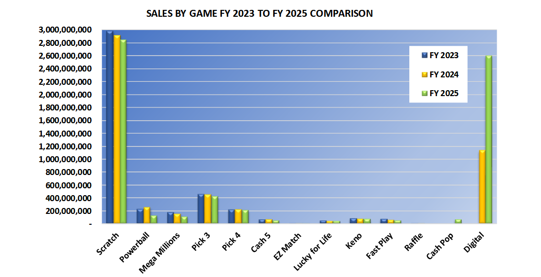 Between Mega Millions and Powerball, there were only two drawings that exceeded $800 million in FY 2025, compared to six in FY 2024, according to the document.