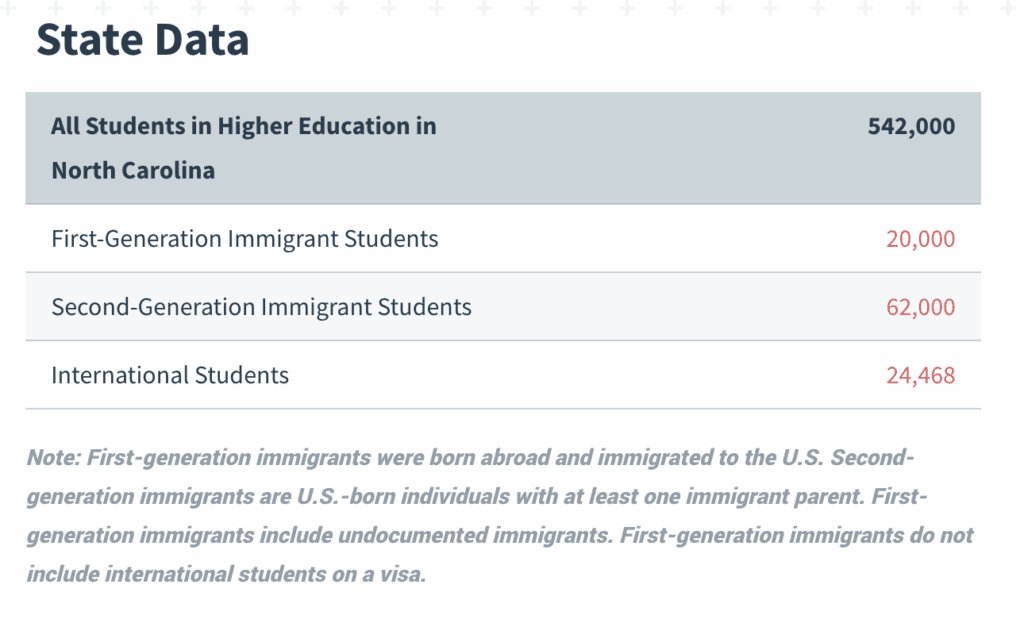 In North Carolina, there are 20,000 first-generation immigrant students enrolled in colleges and universities and 62,000 second-generation immigrant students, according to data from the Higher Ed Immigration Portal.