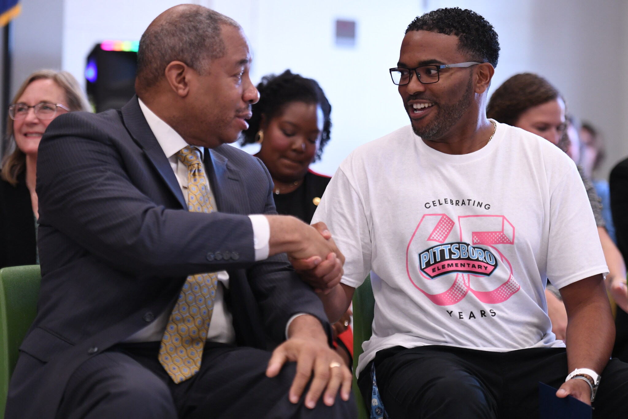 Bishop surprised Henderson with the award during a schoolwide assembly honoring Pittsboro Elementary School’s 65th anniversary in the school gym, according to a release from Chatham County Schools, along with state Superintendent Maurice “Mo” Green.