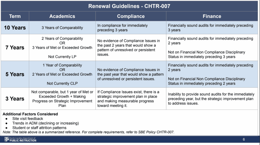 According to OCS, DPI’s Office of School Business will share an update on renewal schools in January, followed by CSRB voting on renewal terms in February and March.