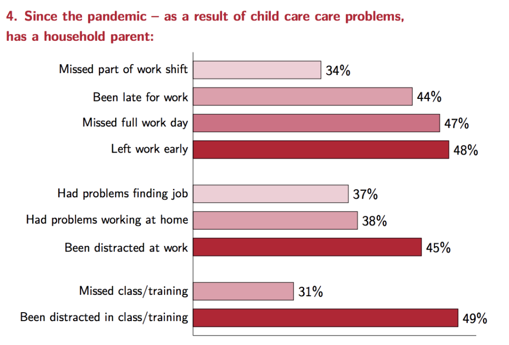 Since the pandemic, the study found new kinds of work disruptions due to child care issues. Forty-seven percent of respondents said they missed a full work day due to inadequate child care. Thirty-seven percent said they had problems finding a job due to child care issues.