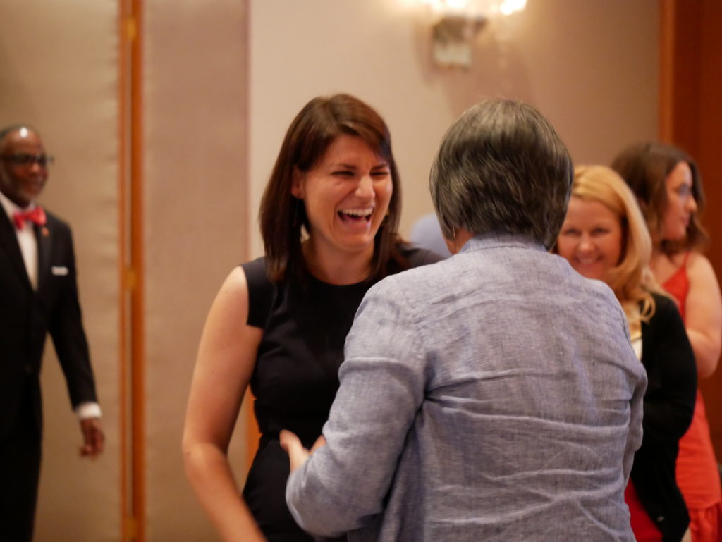 Elena Ashburn returns to her table of colleagues and family after accepting her award. Liz Bell/EducationNC