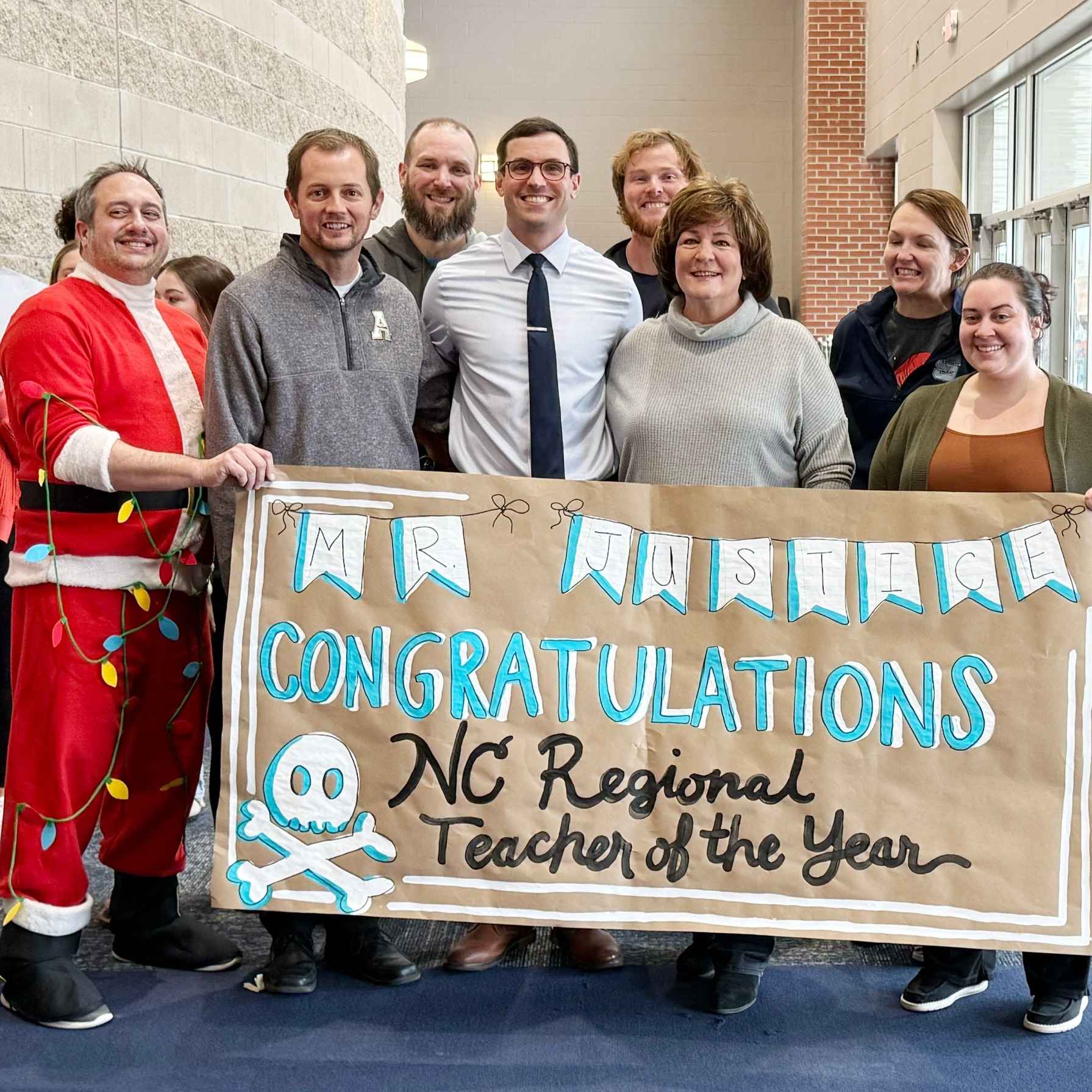 Outside of his classroom, Justice supports his school as a member of the strategic planning team, a member of the Teacher Leadership Council, and the advisor for Fellowship of Christian Athletes (FCA). Involved in FCA since he began his teaching career at Swansboro High in 2012, he has seen participation grow from 15 students at weekly meetings to more than 250.
