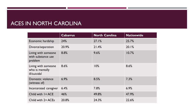 Returning to Cabarrus County, my program director and I immediately set up several meetings with the Kannapolis City Schools and Cabarrus County Schools leadership teams. We were intentional on meeting with multiple facets of the school system – the directors of student services, student support services, principals, and superintendents – so that all groups could give their input about how they saw ACEs impacting their school communities and what the best next steps would be.