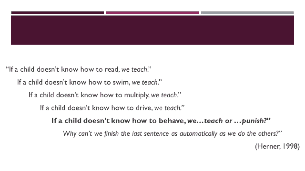Recently, a seventh grader I work with tore a teacher’s book and showed little remorse for doing so. Initially, his teaching team and I were very upset with him and struggled to understand why this typically mild-mannered student would behave this way. However, rather than allowing the situation to worsen or focusing only on the punishment component, the student, one teacher, and myself sat down to discuss the situation and what had led up to it, as well as the ramifications following the incident. The key to this conversation being a truly positive turning point was that the teacher and I asked questions like “what happened that week before the book incident? How did you feel afterwards? How do you think your teacher felt?” By asking these questions, rather than solely blaming the student for his actions, we created an environment in which he felt safe enough to disclose some personal experiences that had deeply impacted him that week while allowing him to consider how his behaviors had greatly disrespected his teacher. A week later, a much more encouraging behavior report was given by all his teachers and the student beamed when he heard the positive things they shared.