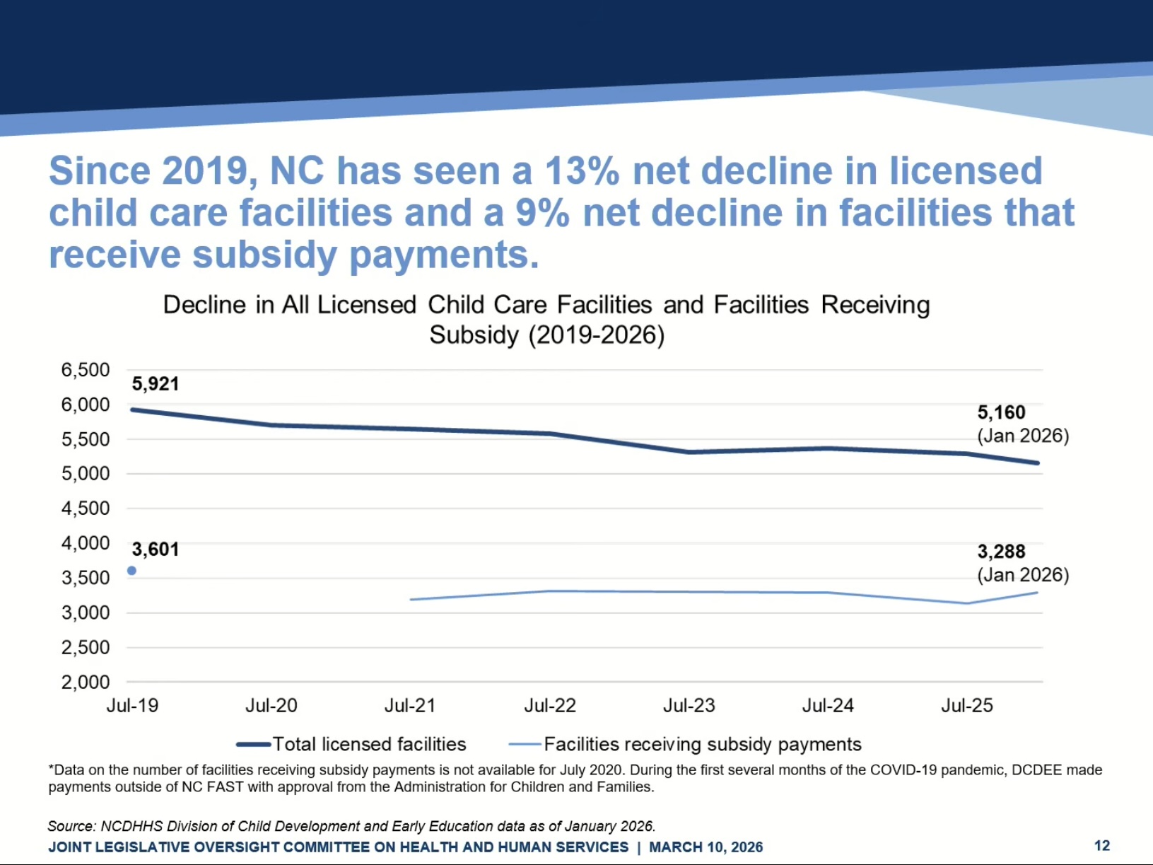 Witherspoon reported 5,160 licensed programs in January 2026, compared to 5,921 programs in July 2019. She said the division projects that overall number to fall below 5,000 in 2027, “which would be a historic low for North Carolina and put significant operational and financial strain on businesses, reduce tax revenue and negatively impact the state’s overall economy.”