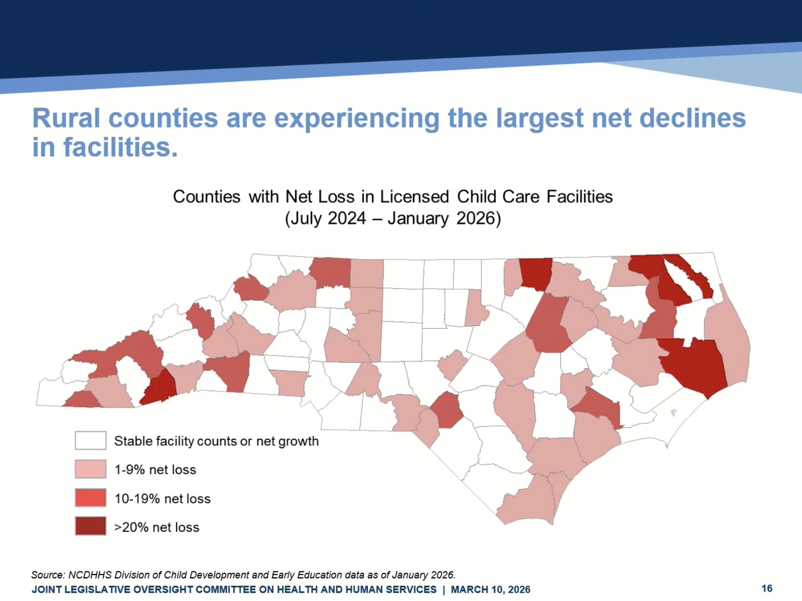 North Carolina has experienced a 13% net loss of child care programs since 2019, with record lows of licensed care expected in the next year, said Candace Witherspoon, director of the Division of Child Development and Early Education (DCDEE) to legislators Tuesday.