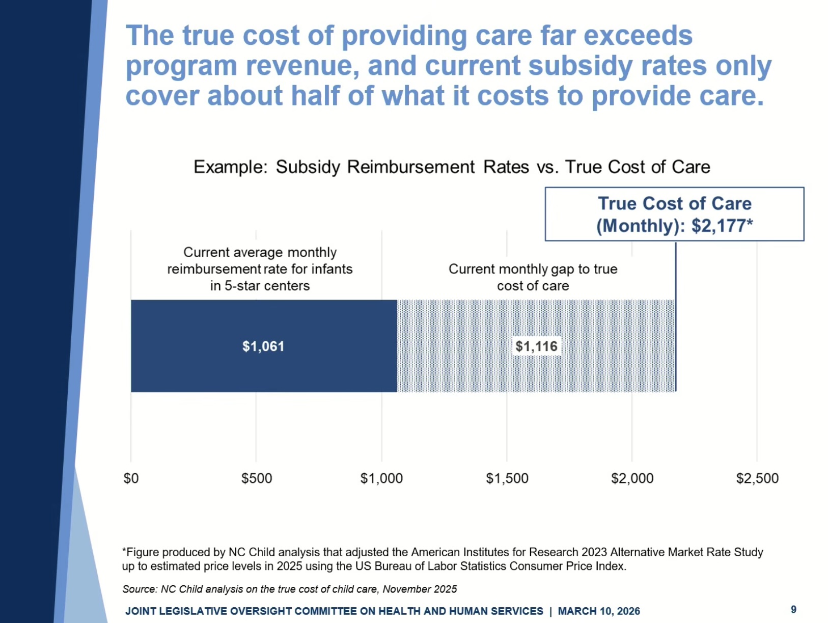 Witherspoon outlined the social, academic, and economic benefits of high-quality early care and education for children and families. She pointed to an estimated $5.65 billion in annual economic loss for the state due to lack of child care access, from a 2024 report from the U.S. Chamber of Commerce Foundation, the N.C. Chamber Foundation, and NC Child.