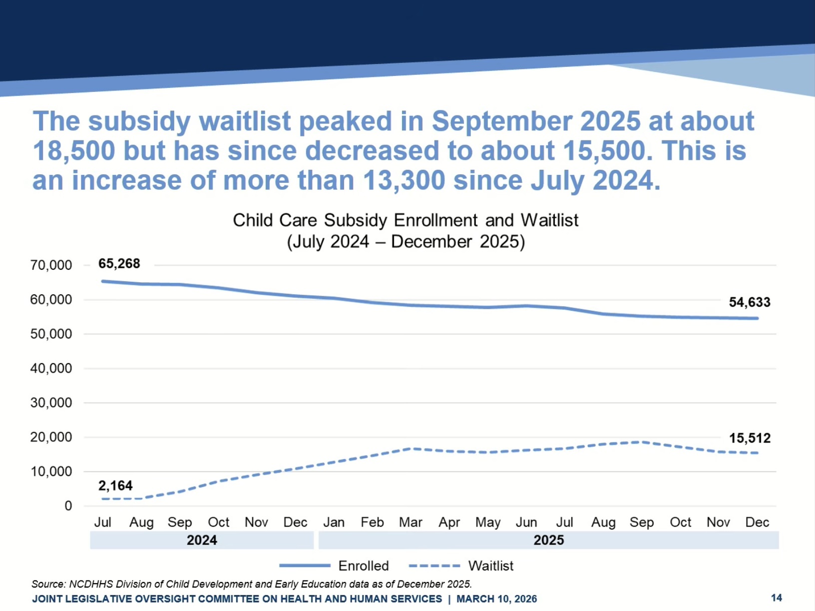 However, the number of children served through the program has declined by about 15% since 2019, Witherspoon said. And the waitlist for subsidized care is seven times bigger than in mid-2024, increasing from 2,164 children in July 2024 to 15,512 in December 2025.
