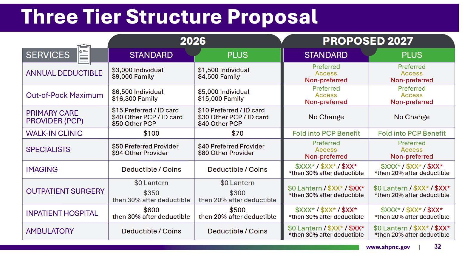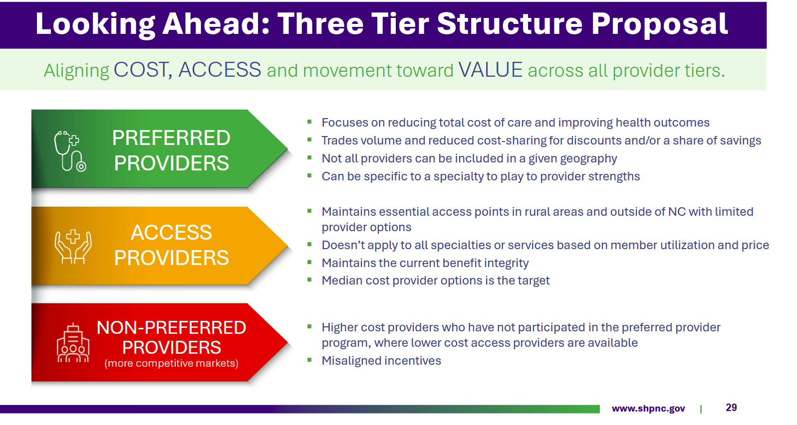 The three tiers of the provider structure would be Preferred, Access, and Non-Preferred, according to meeting materials. SHP members could still use any in-network provider, but the aim is that members would choose preferred providers more often because of their lower out-of-pocket costs.