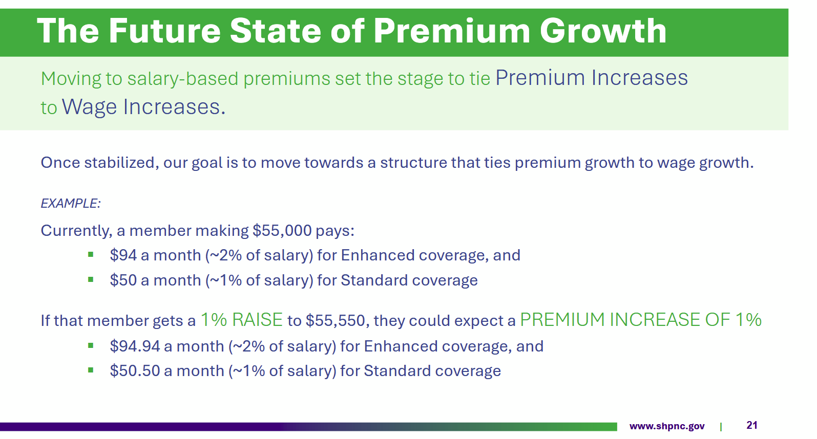 Another contributor to financial stability for the SHP is a long-term strategy of proportional salary/premium increases for members, Friedman said. That means that for members, a 1% salary increase would roughly translate to a 1% premium increase.