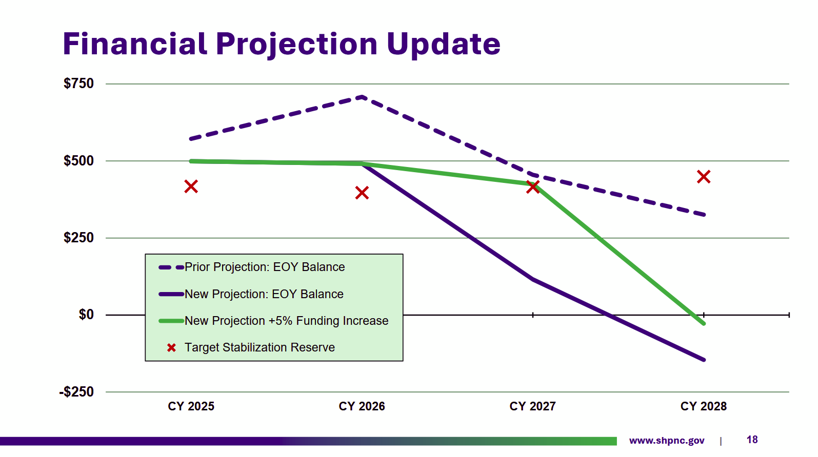 Projections Friedman presented at the meeting showed that, amid rising health care costs, the SHP will stay above its target stabilization reserve level in 2026, and — assuming the General Assembly provides the SHP with a 5% budget increase this year — in 2027.