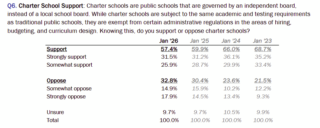 The data showed a slight decline in opinion of charter schools, which Bryson said calls for more promotion of charter schools.