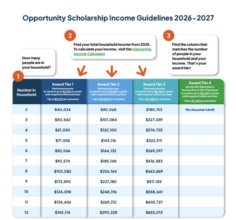 Depending on family income, recipients will be eligible for between $3,574 and $7,942 in 2026-27, based on the tuition and fees charged by the private school they will attend.