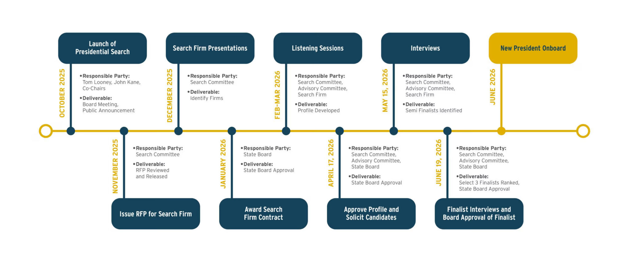 In October, the Board created a six-person presidential search committee, composed of existing Board members. That committee is the voting body leading the search and will conduct finalist interviews before submitting a ranking of three finalists to the State Board.