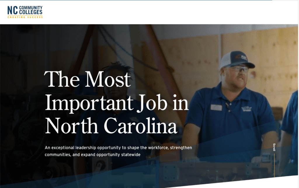 In early April, the NCCCS launched a website for the search, dubbing the role “the most important job in North Carolina.” For the first time, CEO has been added to the president’s title, which Board Chair Tom Looney said reflects that the position’s roles and responsibilities are aligned with those of a chief executive officer.