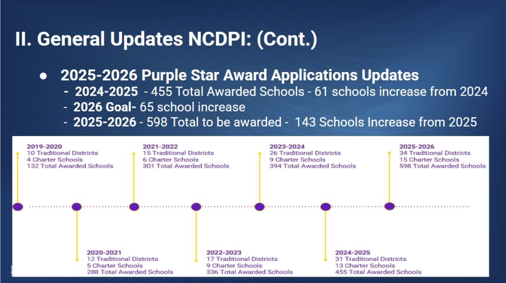 “North Carolina is home to a large population of active duty, guard, reserve, and veteran armed services members, and the state’s public schools reflect that,” DPI’s website says. “In 2019, The North Carolina Department of Public Instruction launched the Purple Star Award Designation initiative to recognize the state’s strong military presence and its support for military families.”