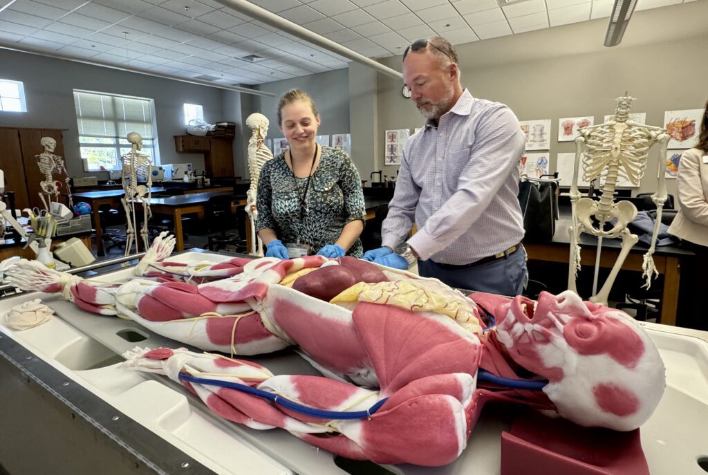 Summer Jolly, the lead biology instructor, says anatomy instruction historically has been static, but the SynDaver allows students to interact with it — moving it, squeezing it, and taking out sutures to explore how the human body all fits together.
