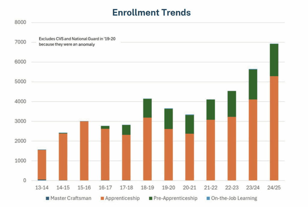 The state’s apprenticeship program reported record growth in its 2024-25 annual report, with 5,241 new apprentices joining the program to reach a total of 16,446 apprentices. There were 555 new high-demand occupations during 2024-25, according to the report, and 1,700 new pre-apprenticeship enrollments.
