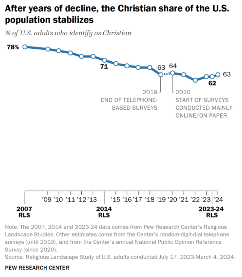 “The latest RLS, fielded over seven months in 2023-24, finds that 62% of U.S. adults identify as Christians. That is a decline of 9 percentage points since 2014 and a 16-point drop since 2007,” a February Pew article says. “But for the last five years, between 2019 and 2024, the Christian share of the adult population has been relatively stable, hovering between 60% and 64%.”