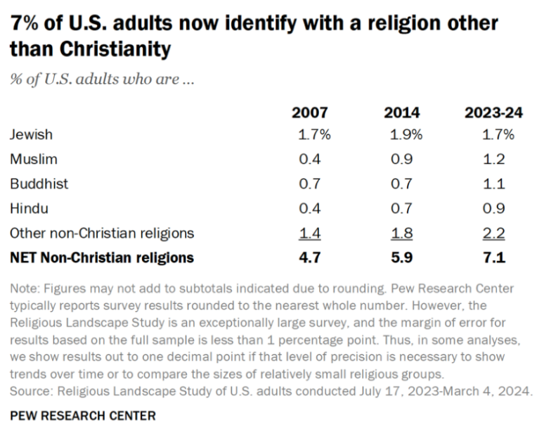 Approximately 7% of United States adults now identify with a religion other than Christianity, the study found.