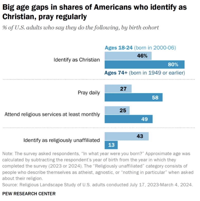 According to the data, the youngest adults in the survey were less likely to identify as Christian, pray daily, and say they attend religious services at least monthly.
