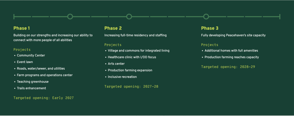 Peacehaven brings people of all abilities together and provides services for adults with intellectual and/or developmental disabilities (IDD). In the next few years, Peacehaven’s 89 acres of farmland will undergo a physical transformation with the addition of a multipurpose community center, residential housing, and more, thanks to a successful multimillion dollar fundraising campaign.