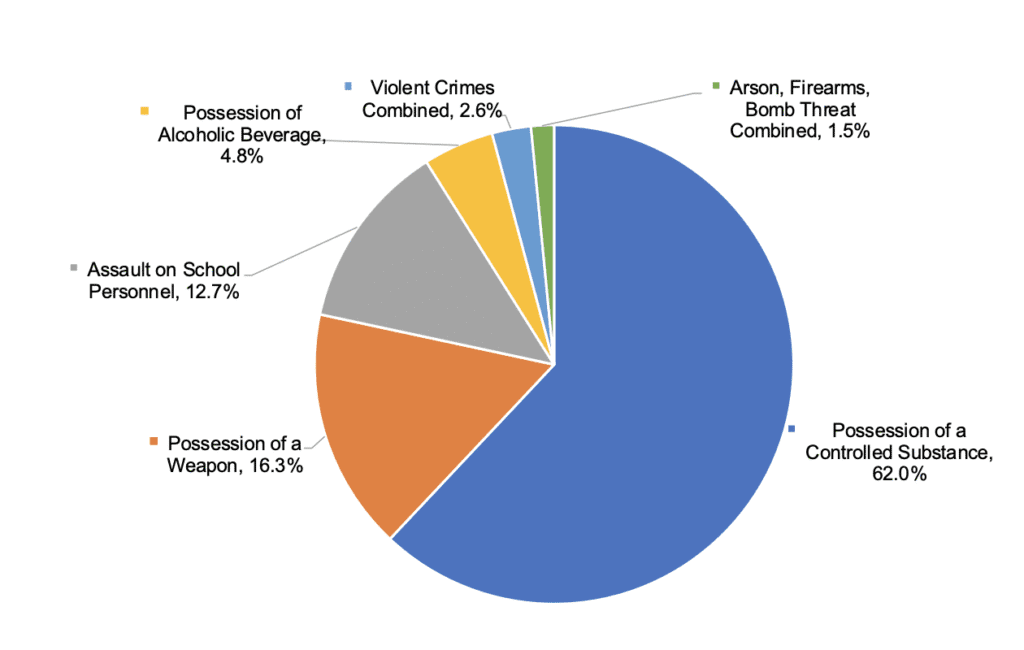 Only 2.6% of reported acts in 2024-25 were violent, the report shows. The vast majority of acts were possession offenses, particularly related to controlled substances (62%), which “includes Marijuana, Heroin, LSD, Methamphetamine, Cocaine, or any other drug listed in Schedules I-VI of the North Carolina Controlled Substances Act” (G.S. §90-89 through 90-94).