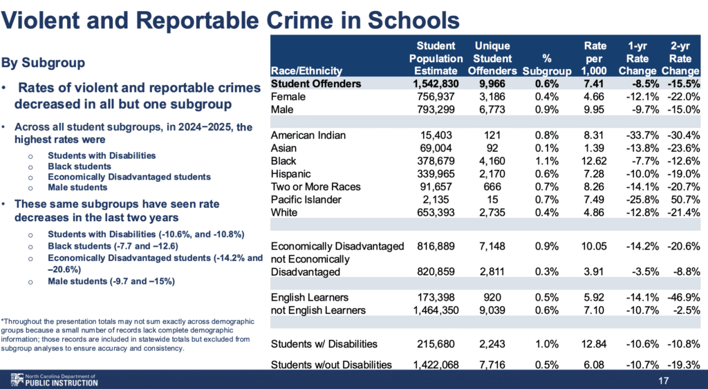 Reports of crime and violence in North Carolina public schools decreased during the 2024-25 school year for the second consecutive year, according to an annual report from the Department of Public Instruction (DPI) presented to the State Board of Education this week.