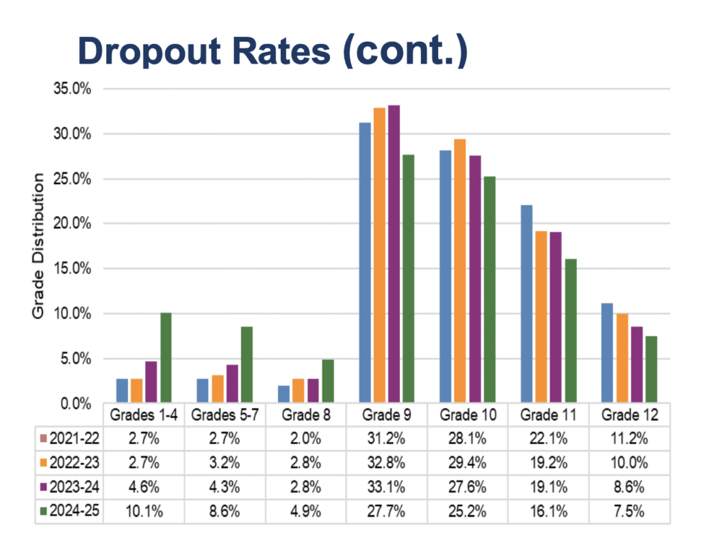 There were a total of 10,478 students in grades 1-13 who dropped out in 2024-25, with 76.5% of those students dropping out in grades 9-13.