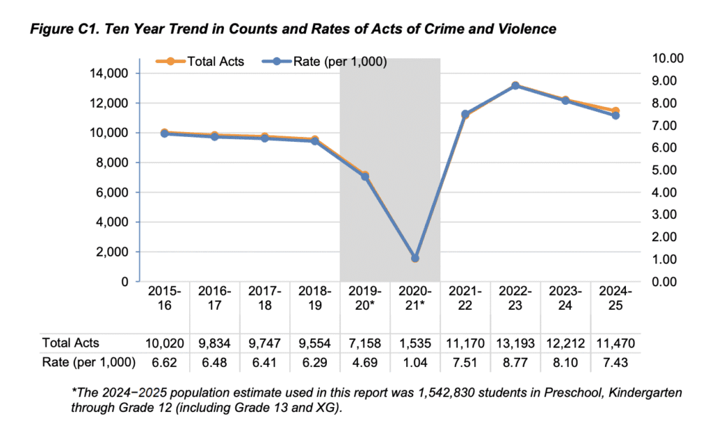 During the 2024-25 school year, there were 11,470 total reported acts of violent and reportable crimes committed by students (11,429) and non-students (41). This reflects a 6.1% decrease in the number of reportable acts compared to the 2023-24 school year (12,212), the presentation says, and a 8.2% decrease in the rate of acts per 1,000 students. Generally, the rate of acts is a more accurate way to make a comparison to prior years, Maher said, as it adjusts for the size of the group.
