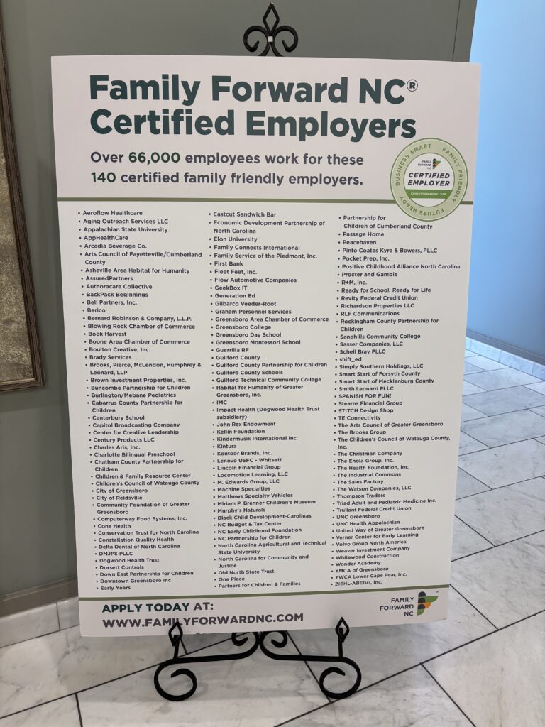 The event was organized by Family Forward NC®, an initiative administered by the North Carolina Early Childhood Foundation (NCECF). Businesses and communities that participate can earn a Family Forward NC certification, recognizing businesses that offer a full suite of family-friendly benefits.