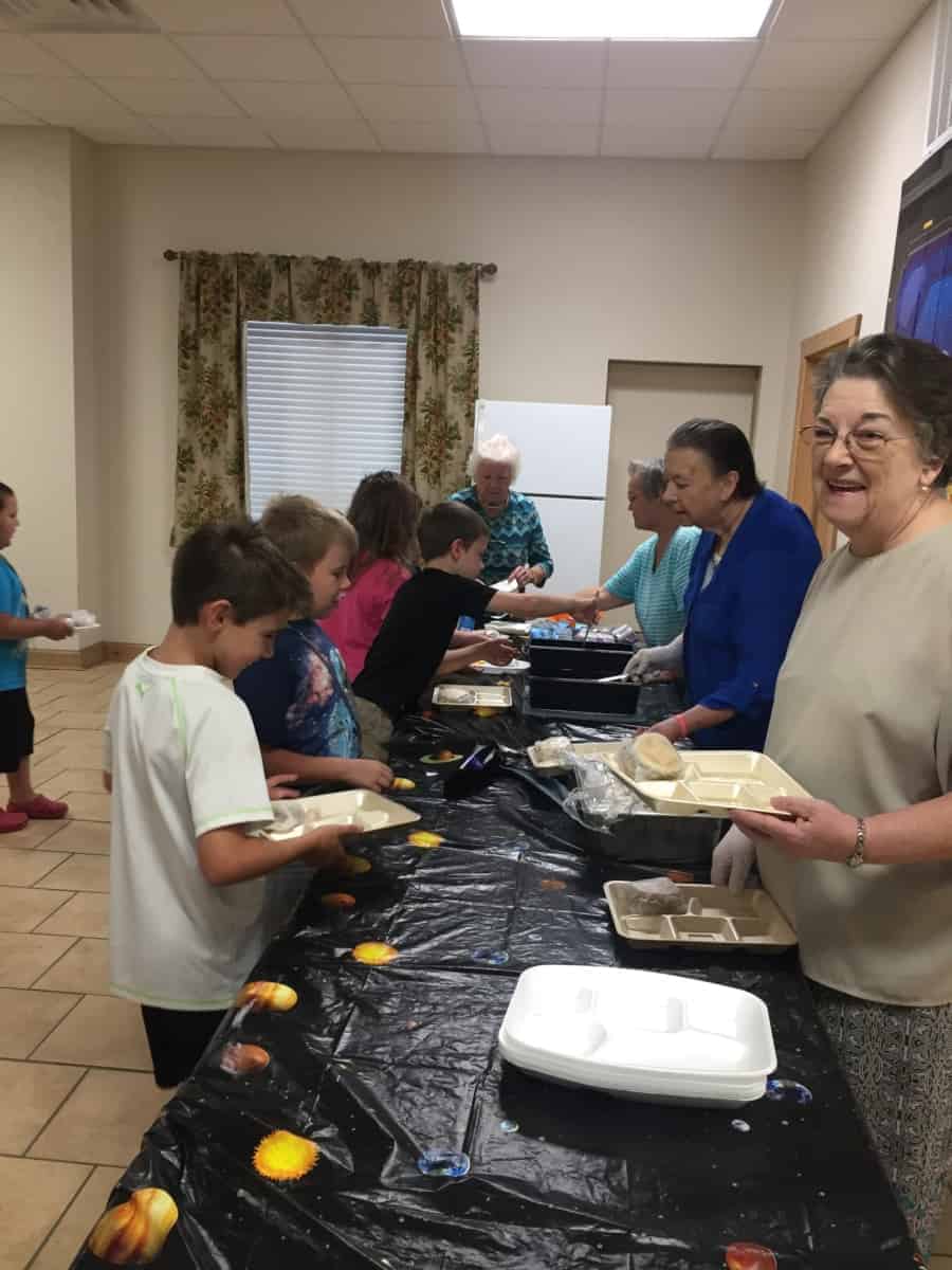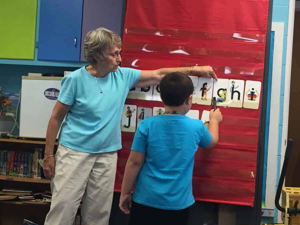 Four women from Mt. Carmel Baptist Church stand behind a make-shift breakfast buffet in the Bryson City United Methodist Church building, serving children sausage biscuits at 8:30 a.m. The room is out of this world — literally — decorated as a space ship with windows to view the greater galaxy, planets, stars, and the occasional cartoon alien. Rising first, second, and third grade students trickle in, taking a plate of food or plopping down beside friends. This is the second week of Swain County’s Congregations for Children (C4C) literacy camp, and the kids know the drill.