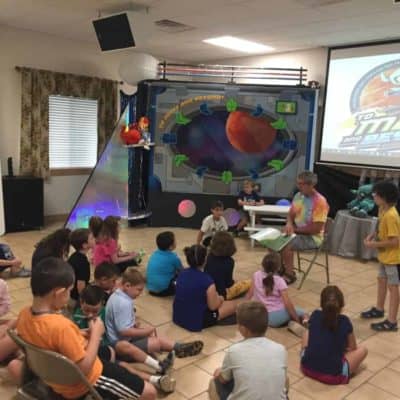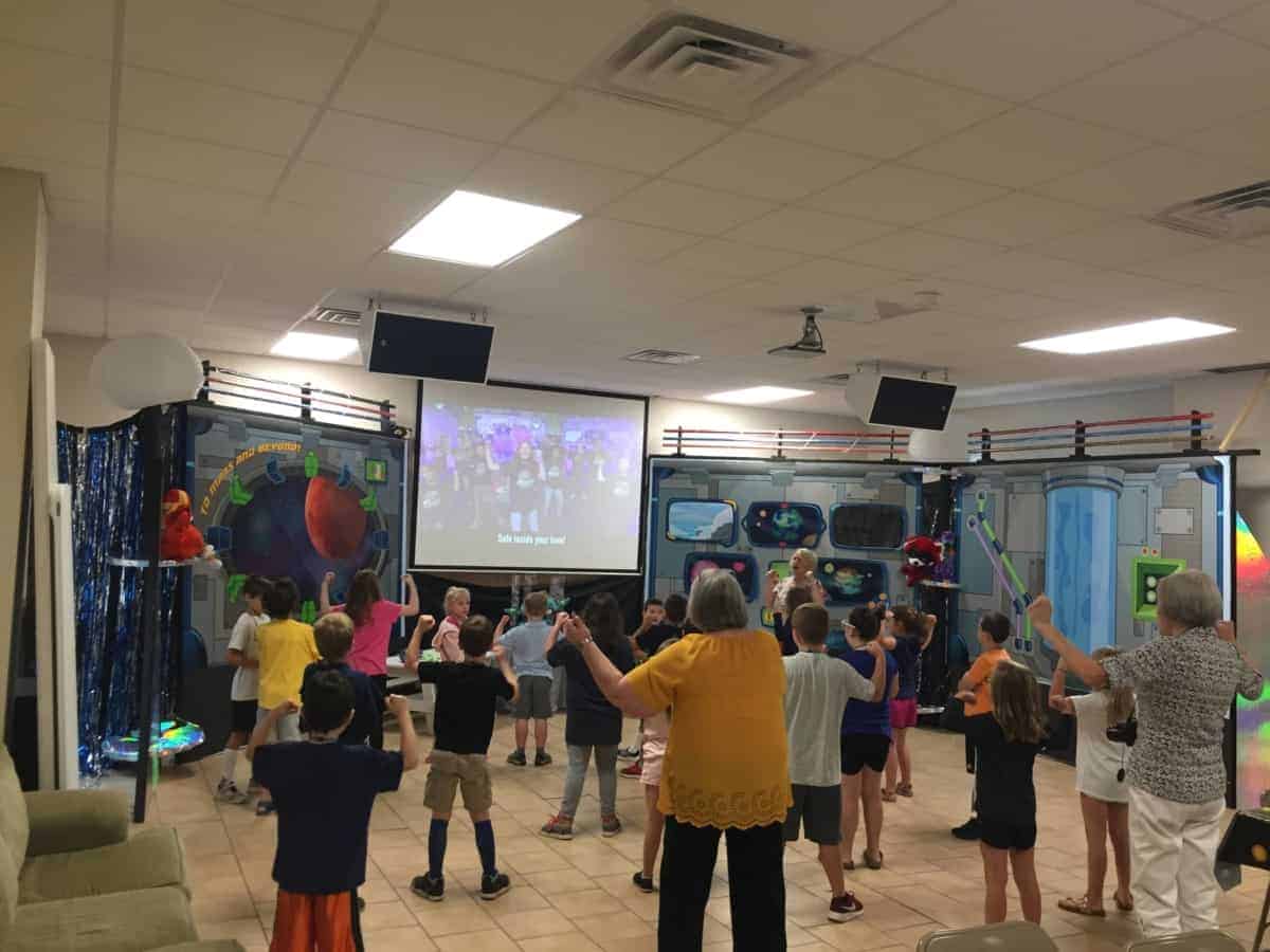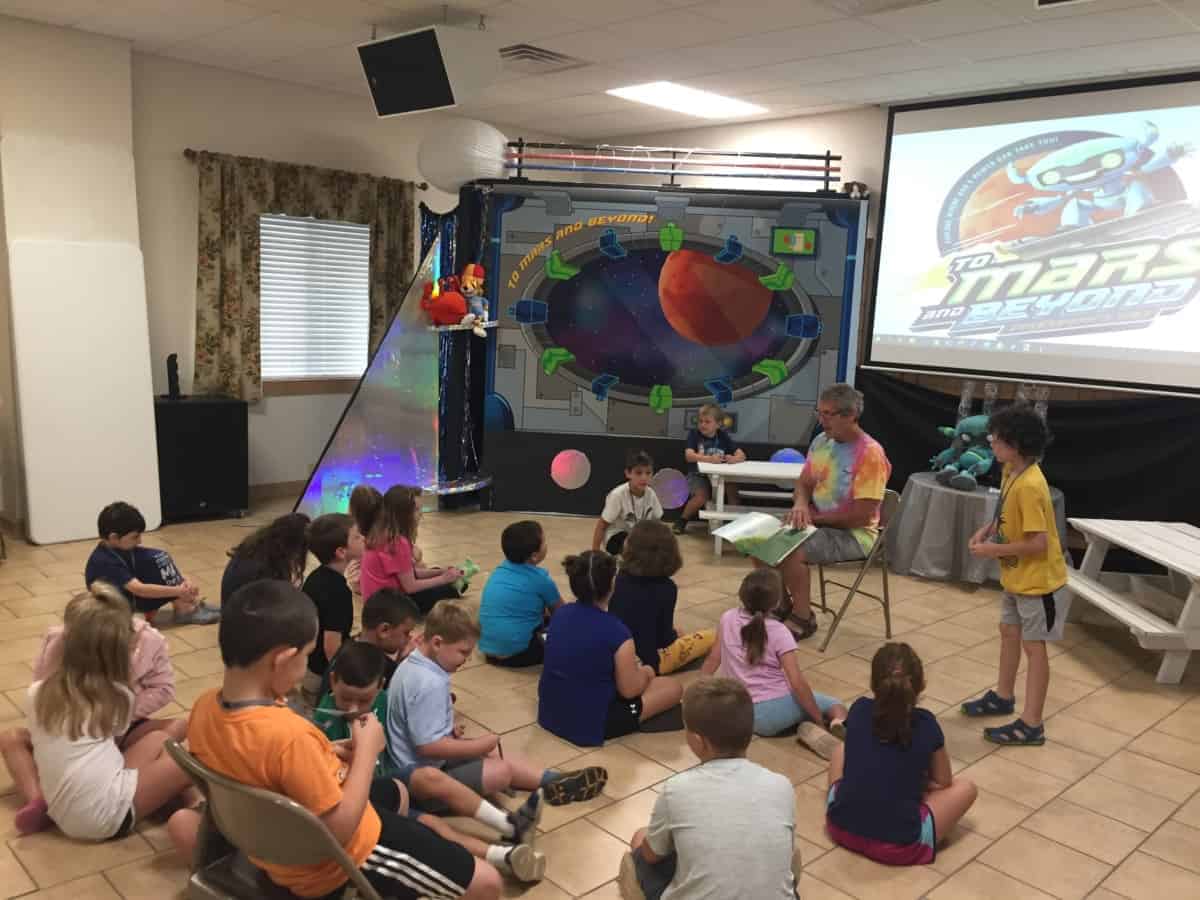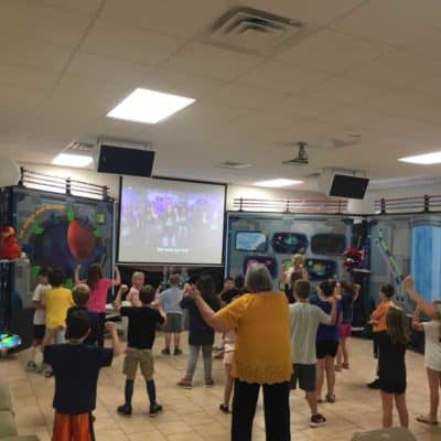 After breakfast, students gathered around the spaceship set and read a book about the solar system. Wayne Dickert, pastor at Bryson City UMC, narrated, and then the group stood up for some dancing and singing.
