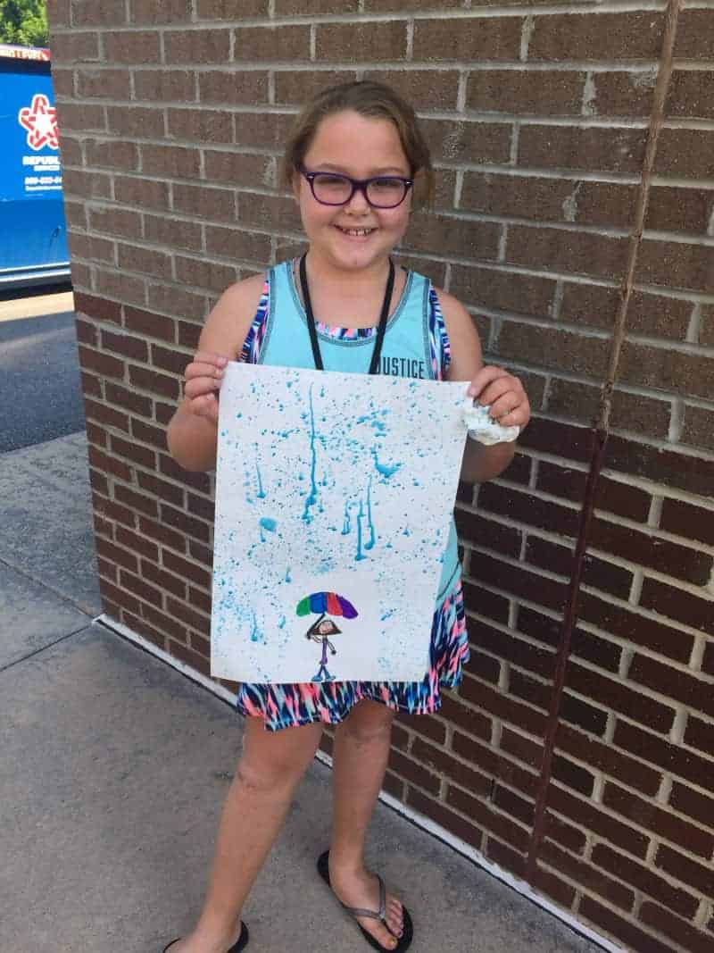 “The theme for third grade this particular week was the weather. Students drew rainy-day portraits of people holding umbrellas. Earlier in the week, they watched a video about Jackson Pollock and his interesting splatter painting technique. Students looked closely at some of Pollock’s artwork and then used his technique to splatter paint rain in their pictures.”