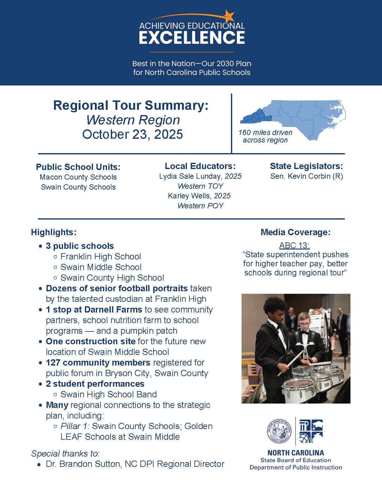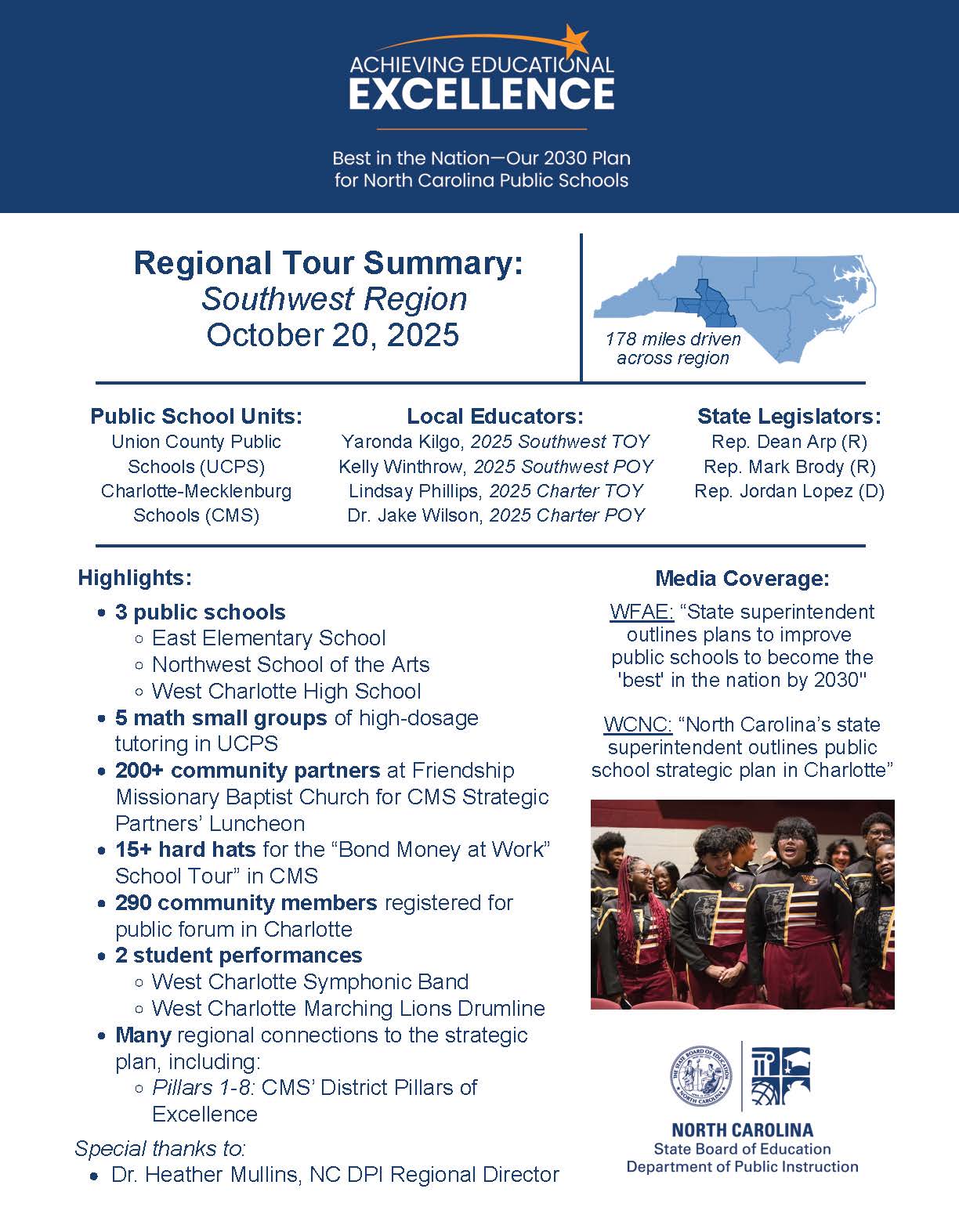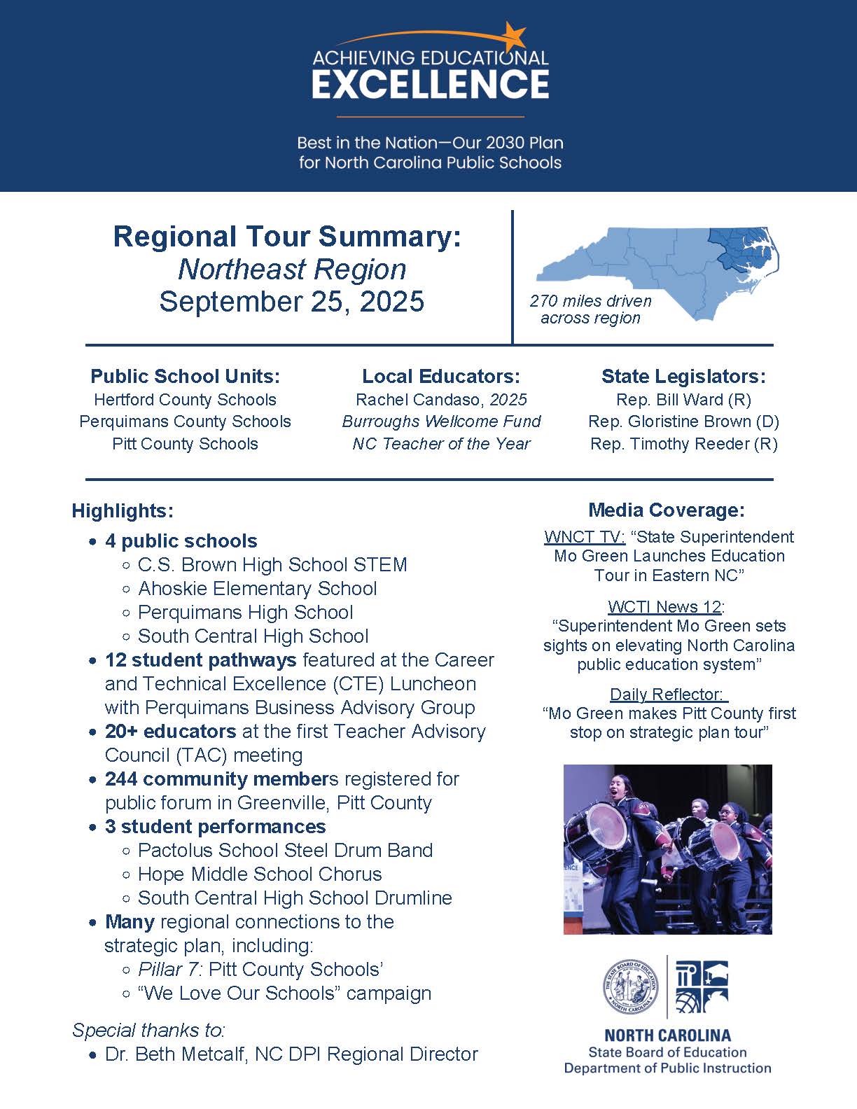 Green and leaders from the N.C. Department of Public Instruction (DPI) traveled 1,413 miles, visiting 21 districts, 26 schools including one charter, five construction sites, three community colleges, and two four-year universities, according to a summary report of the tour.