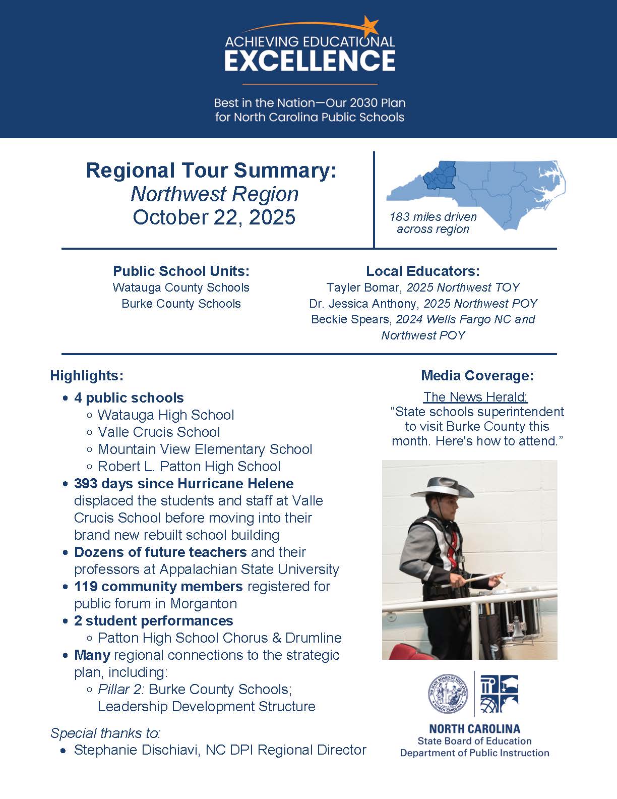EdNC accompanied Green and the team at each stop to document the tour, where it went, who leaders met with, the types of experiences incorporated, how the strategic plan addresses feedback from the spring listening tour, how the strategic plan is already being implemented statewide, and receptivity to Green’s leadership.
