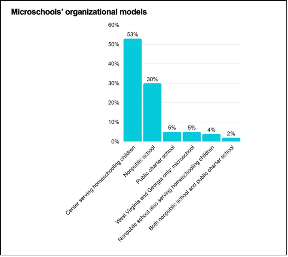 Microschools are organized into a range of structures, the report found. The majority, 53%, operate as learning centers for homeschooling families. Another 30% are nonpublic schools, while 5% operate as public charter schools. A small percentage use overlapping models.