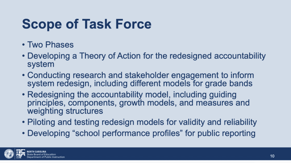 Over the last few years, and under the leadership of former state Superintendent Catherine Truitt, DPI advocated for state lawmakers to change how school performance grades are calculated to account for more factors than achievement and growth. While lawmakers initially showed interest in DPI and Truitt’s plan, they never passed legislation changing the formula. Even before Truitt, lawmakers and the Board have discussed how to change the state’s school accountability model. The creation of a task force this fall reflects another attempt by DPI to reform school performance grades.