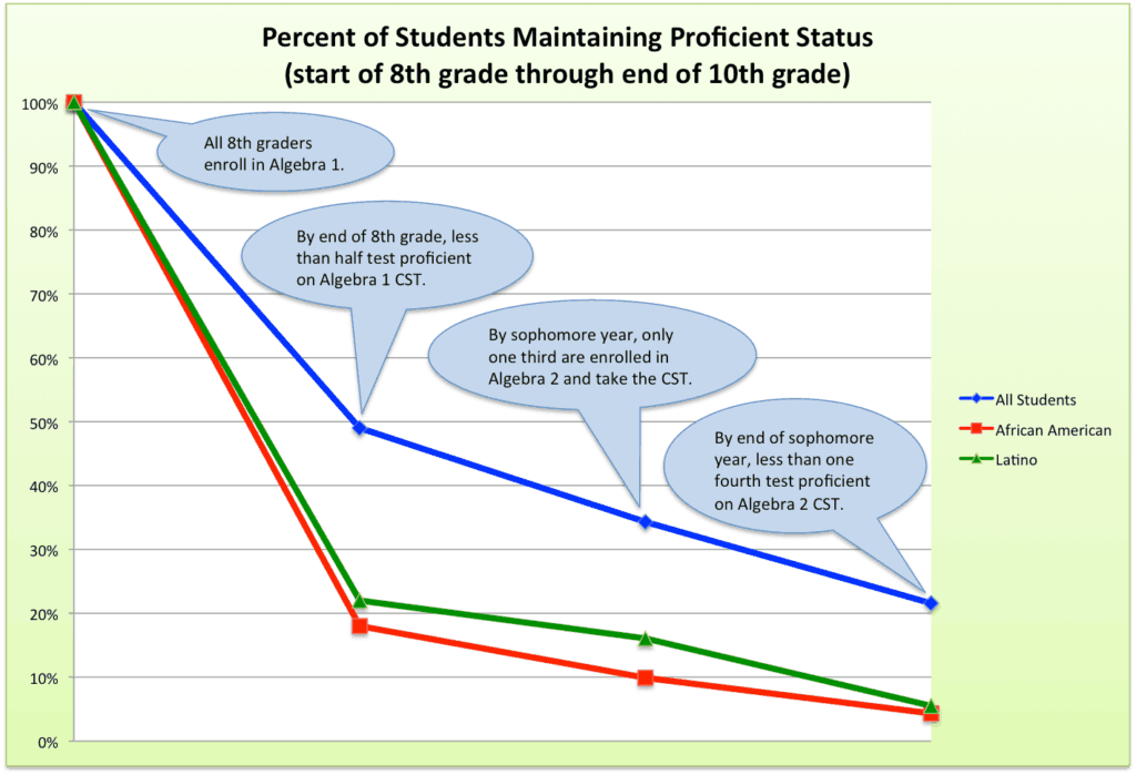 Since 2014, the district has “detracked” their mathematics courses up until 11th grade. They did so in response to severe declines in proficiency scores on state tests across all grade levels which were leading to high retention rates. For example, of the eighth graders taking Algebra I in the tracked system, a whopping 40 percent of them were being retained the next year.
