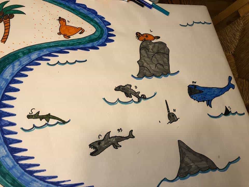 In the case of this lesson, Cox knew she wanted to focus on ocean art projects and then added in the element of pirates. The video begins with a talking parrot who tells students that the lesson will focus on landscapes, portraits, and still lifes. After defining each of those terms and showing a few examples, Cox reads a pirate-themed book called Henry and the Buccaneer Bunnies. Then, Cox and her family members act out a a pirate-themed skit, followed by a cooking segment where Cox makes a healthy snack called “Walk the Plank Pirate Booty.”