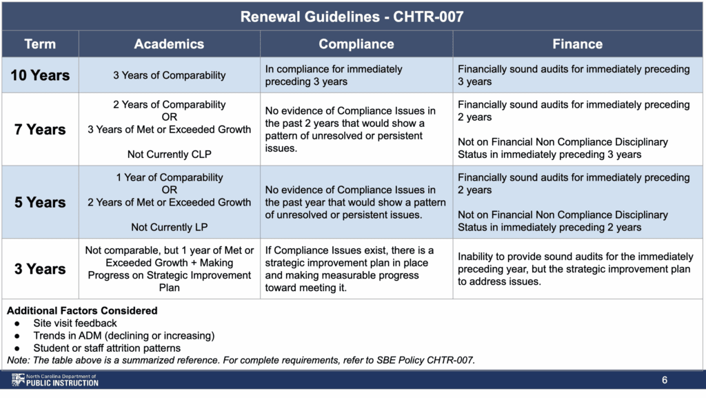 Four schools presenting this month had stipulations on prior renewals, specifying requirements around training, academic growth, and more. Those schools are Next Generation Academy, Rocky Mount Preparatory, Z.E.C.A. School of Arts & Technology, and Paul R. Brown Leadership Academy (PRBLA), a military charter school.