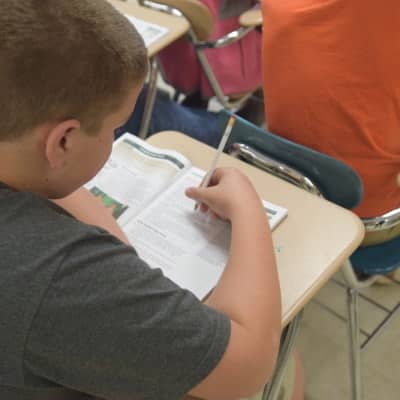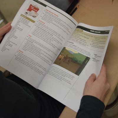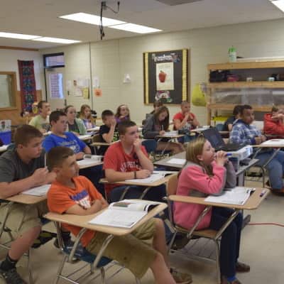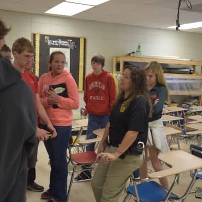 As Becky Stewart, the CTE director, walks me down to a hunter safety class, she notes, “We are a community of hunters, fishers.” Seventeen eighth graders, including six girls, file in to the class and take a seat. The class is being taught by Chris Roberts, a teacher who has been hunting since his father took him when he was in elementary school, and Officer Posey, a school resource officer.
