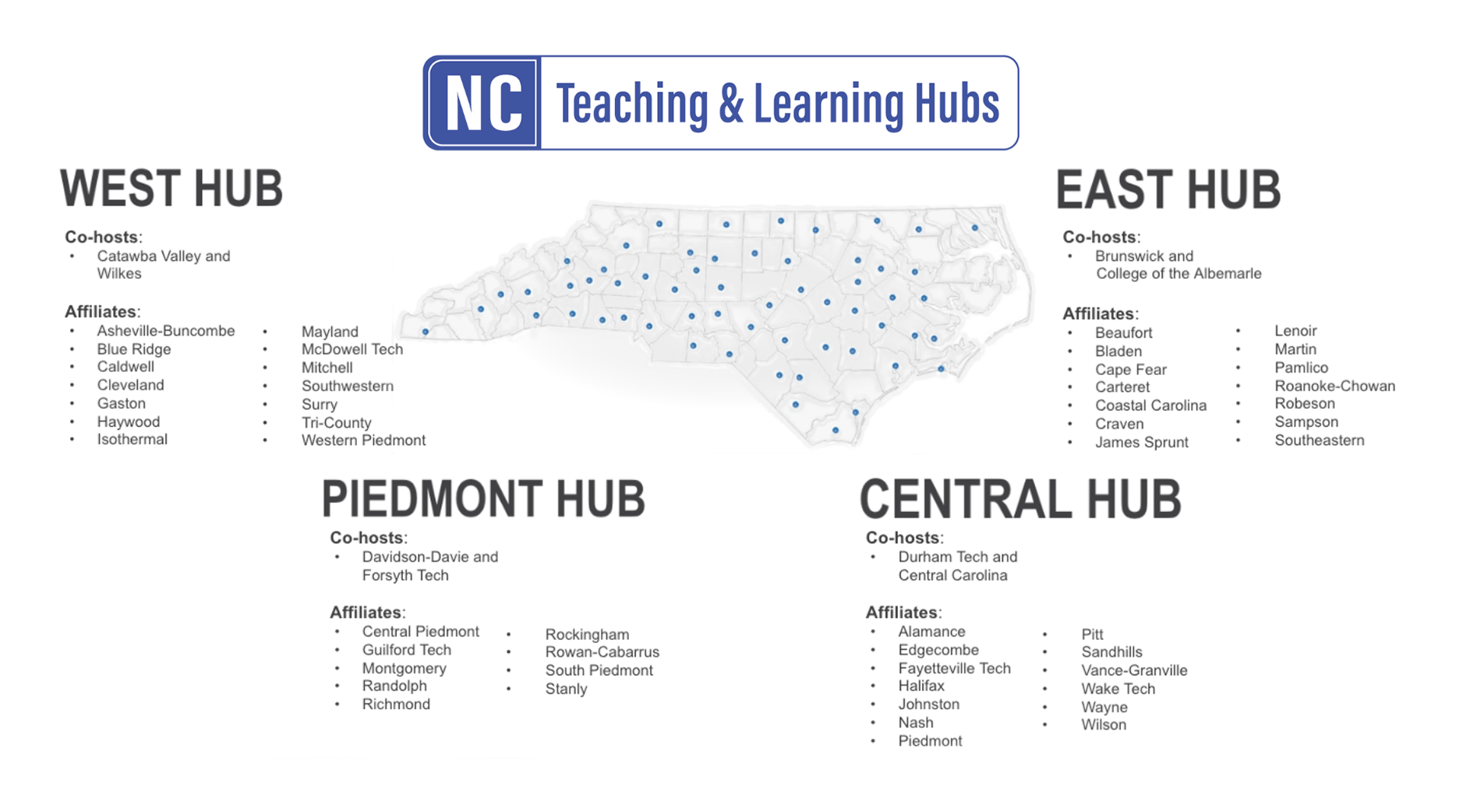 In light of these challenges, resources that can supplement professional development opportunities for community college faculty are the NC Teaching and Learning Hubs. Launched in fall 2021, the four regional hubs provide free, evidence-based, virtual professional learning opportunities for any community college employee.
